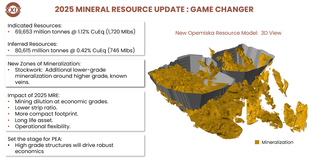 The Opemiska Project, one of Canada's highest grade open pitable copper deposits, spans 21,333 hectares in Quebec's Chapais-Chibougamau region, with strong infrastructure and nearby access to the Horne Smelter. A June 2025 resource update reported a pit constrained resource of 62.7 million tonnes at 1.04% CuEq (Indicated) and 78.4 million tonnes at 0.41% CuEq (Inferred). The new resource contains a significantly lower strip ratio as a result of incorporating lower grade stockwork and drilling at the Saddle Zone. What was previously considered waste is now resource.